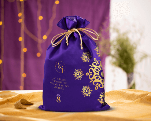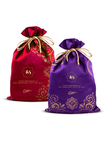 Read MoreA charming, hand-crafted satin potli adorned with intricate wedding motifs, crafted to carry a selection of Cadbury chocolates. In our Wedding Gifting designs, tradition merges with luxury and personalisation. While patterns signify auspicious beginnings, personalised insignias for the bride and groom make the design unique to their special day. This luxurious potli makes a thoughtful and memorable wedding keepsake for your beloved guests.